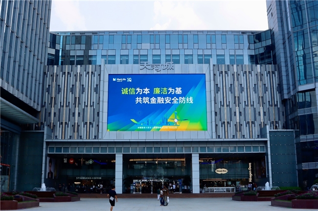 活动期间,醒目的宣传标语“诚信为本,廉洁为基,共筑金融安全防线”在天河城大屏持续滚动播放。此次宣传不仅是一次视觉传播实践,更是公司面向社会作出的庄严承诺:在业务开展的各个环节中,始终坚持以诚信为根本准则、以廉洁为行为基石,切实维护金融市场的稳定与安全。